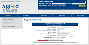 Step 2 (Username): In the new window which will open introduce all the required information including your full name, member number, last four digits of your SSN, email address and your daytime phone. Click on the ‘Submit Forgotten Username Request’ button to forward your request to the bank.