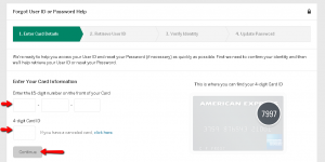 Step 2: In the new opened page, enter your card information including your 15-digit card number and the 4-digit card ID number. Click on the ‘Continue’ button to retrieve your User ID and Password.