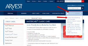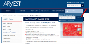 Step 1: Visit the card’s main webpage and press the ‘LOG IN TO…’ button. A series of options will open in a small window right under the login button. Press the Arvest Online Banking option to proceed.