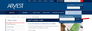 Step 1: From the card’s main webpage, press the ‘LOG IN TO…’ button. A series of options will pop-up in a small window under the login button. Click on the Arvest Online Banking option.