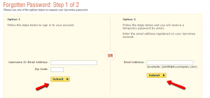 Step 2 (Password): In case you forgot your password, you also have two ways to request another one: 1) Enter your username or email address and your Zip code and click on the ‘Submit’ button, or 2) Enter your email address and press ‘Submit.’