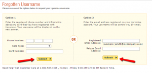Step 2 (Username): If you forgot your username, there are two ways to retrieve it: 1) Enter your phone number, card type and card number and press ‘Submit’ or 2) Enter your registered email address and press ‘Submit.’
