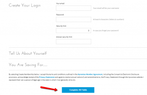 Step 2: Enter in the appropriate fields your email address (which will also be your username), create a password, set up a security hint and an answer to it and press ‘Complete All Fields.’