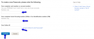 Step 3 (Passcode): From the Sign-in page, press the ‘Forgot your Passcode?’ button. Then, provide 1) your ATM/Debit Cardnumber, Credit Cardnumber, or any of your accounts number, 2) your complete Social Security number (SSN)/Tax Identification number (TIN) and 3) your Online ID. Proceed by clicking ‘Continue.’