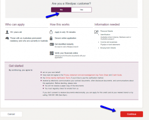 Step 3: On the following page you will be asked once more to select whether you already are a Westpac customer or not and to click on the ‘Continue’ button in order to finally open the online application page.