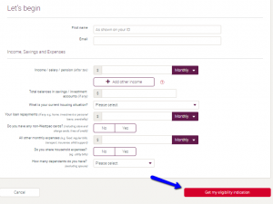Step 4: Enter in the provide fields the following information: your first name, email address, monthly income, savings or pension (after tax deduction), total balances in savings or investment accounts (if any), your current housing situation, your monthly loan repayments (if any), select whether you have or not any non-Westpac cards, enter your other monthly expenses (e.g. food, regular bills, transport, insurance, child support), choose whether you share or not household expenses, select how many dependents you have (excluding your spouse) and press the ‘Get my eligibility indication’ button. Should you be considered eligible you will be asked some further details such as mailing address and phone number before submitting your application.