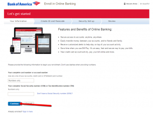 Step 2: Enter the required information in the appropriate spaces including 1) Your complete card number or account number (you can use any one of your accounts, credit card or ATM/debit card number), 2) your Social Security number (SSN) or Tax Identification number (TIN), and then click on the ‘Continue’ button. In the next pages you’ll be asked to create your unique Online ID and your Passcode for future accessing your online banking. After that you can set up your security questions and review your provided data.