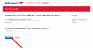 Step 4 (Online ID and Passcode): After clicking on the ‘Forgot Online ID and Passcode’ button, introduce 1) your ATM/Debit Cardnumber, Credit Cardnumber, or any of your accounts number, 2) your full Social Security number (SSN)/Tax Identification number (TIN). Proceed recovering your credentials by pressing ‘Continue.’